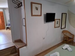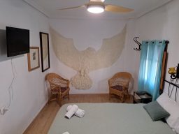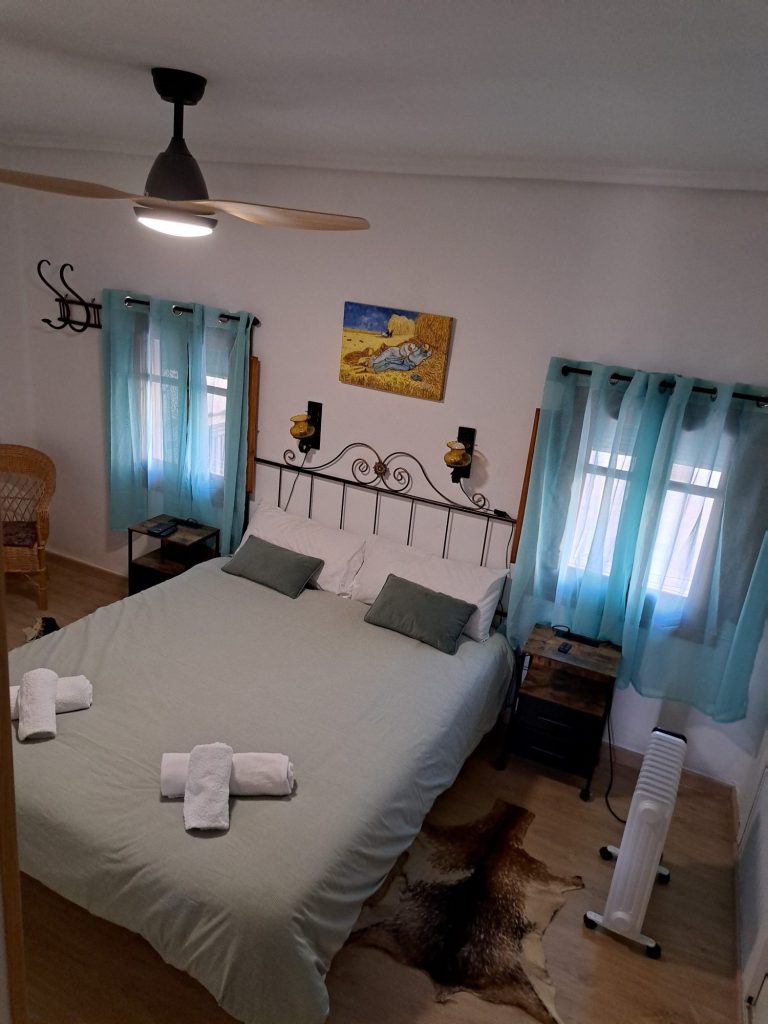 Dormitorio luminoso con ventanas que dán directamente al antiguo claustro o plaza de los Servitas, dispone de calefacción por radiador de aceite wi-fi, ventilador de techo con mando a distancia de 6 velocidades, Tv Smart de 32 pulgadas, mesitas de noche con conectores Usb integrados, amplio armario donde encontrarás repuestos de juegos de cama, almohadones de repuesto e incluso una cuna parque por si vienes con un bebé.