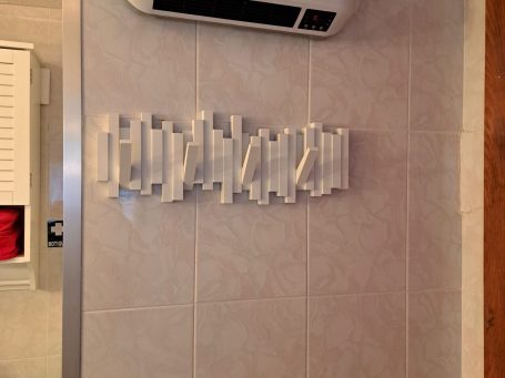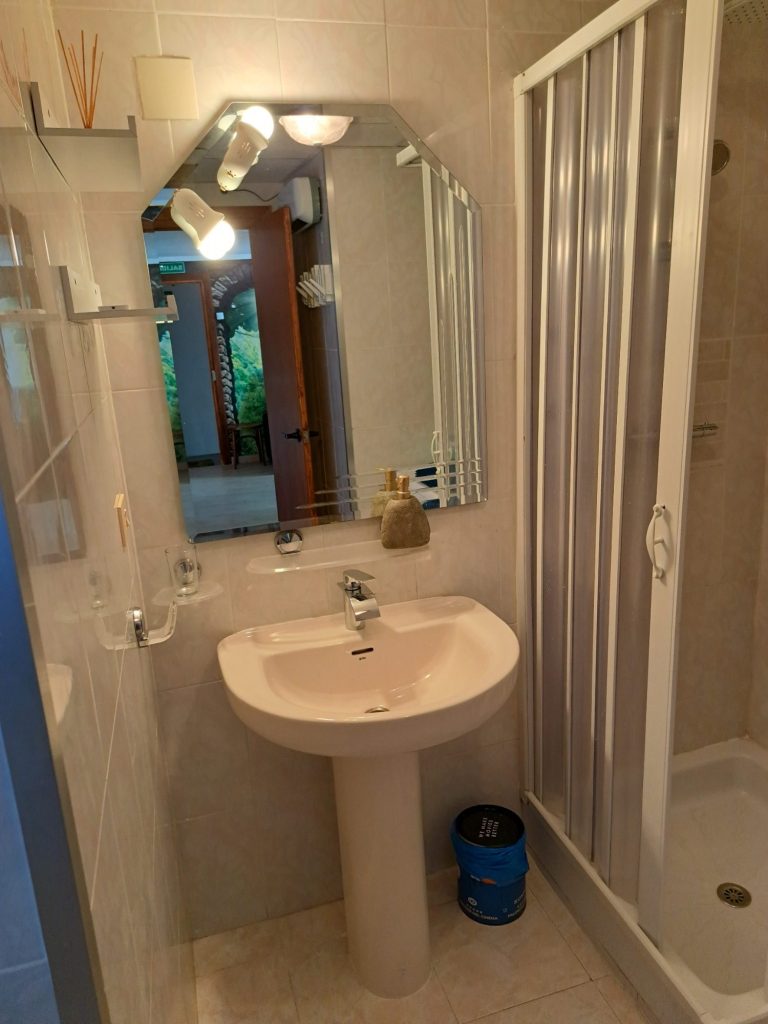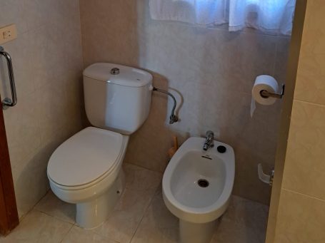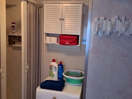 Dispone de ducha termostática con mampara, lavadora con detergente y suavizante, un armario donde se halla un botiquín y un secador de pelo. bidé, inodoro, percha y un calefactor con mando a distancia.